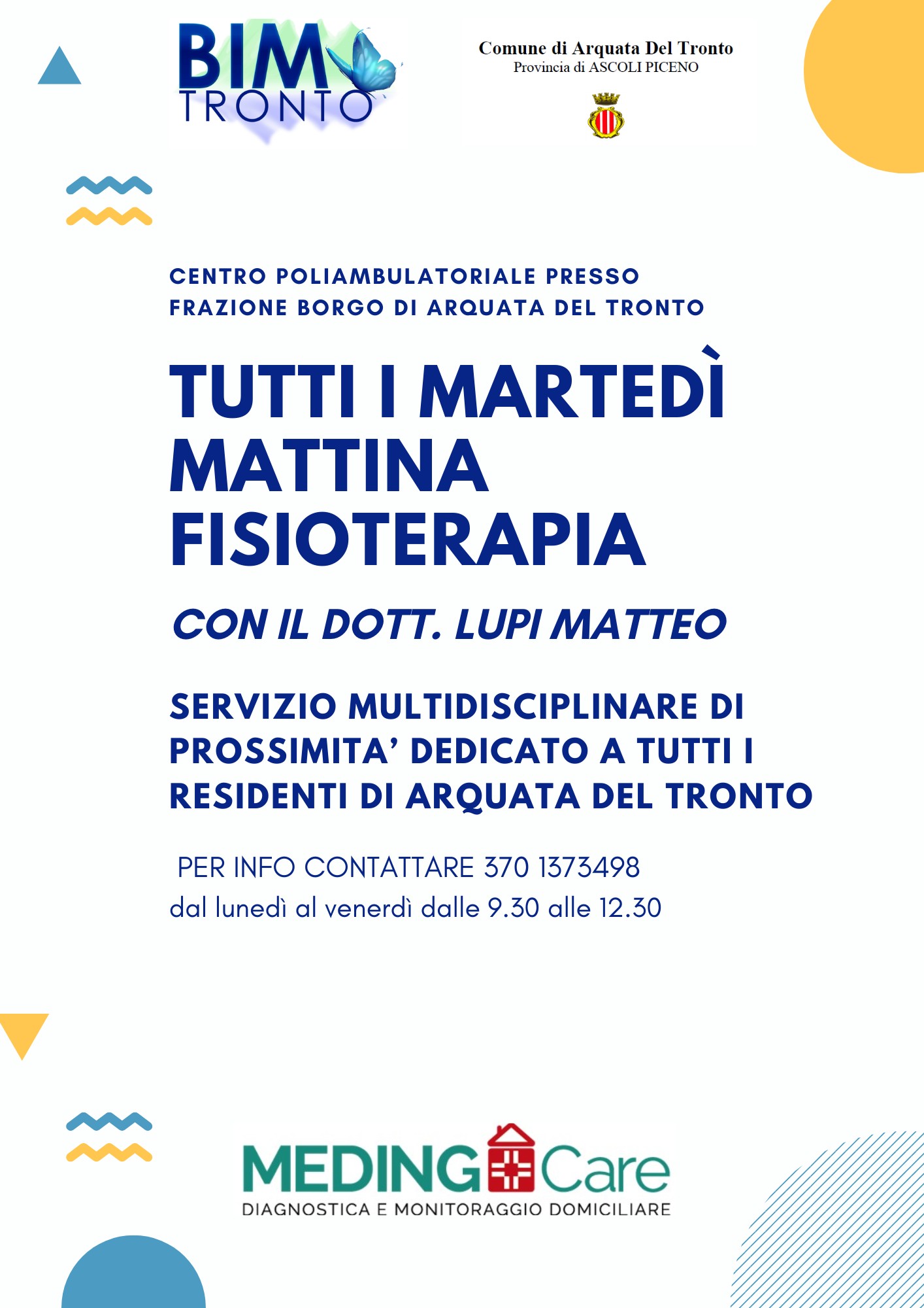 A partire da martedì 4 novembre 2025 e per tutti i martedì mattina, dalle ore 9:30 alle ore 12:30, sarà attivo presso l'ex poliambulatorio sito nell'area Sae di Borgo 1, il servizio di fisioterapia dedicato ai residenti del Comune di Arquata del Tronto.